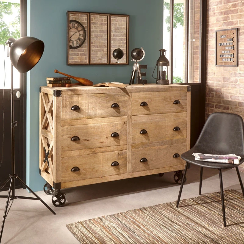 Craquez pour ce buffet en bois de manguier sur roues en fer.