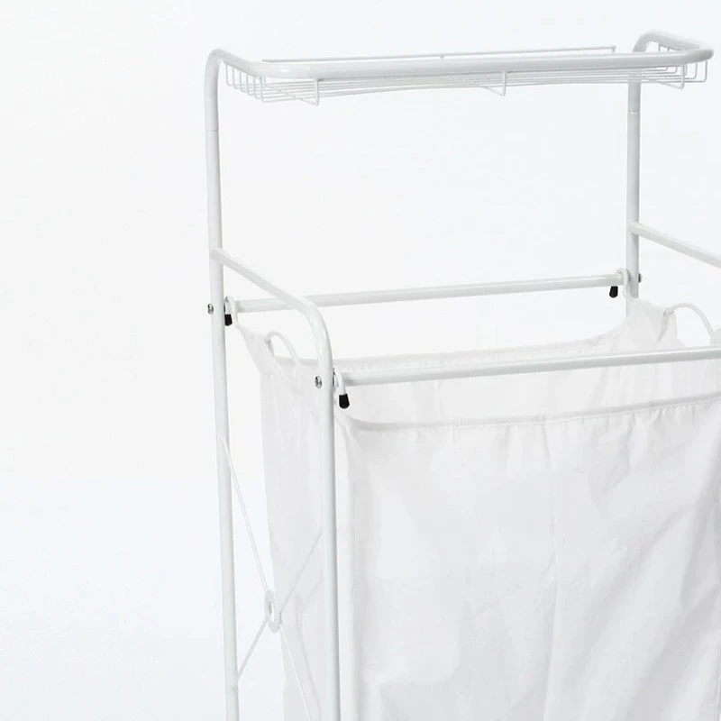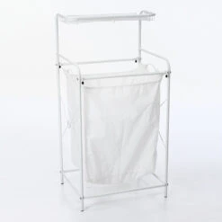 Composé d ‘une structure métallique supportant un panier à linge sale lavable amovible avec crochets + 1 étagère sur la partie supérieur. A monter soi-même.