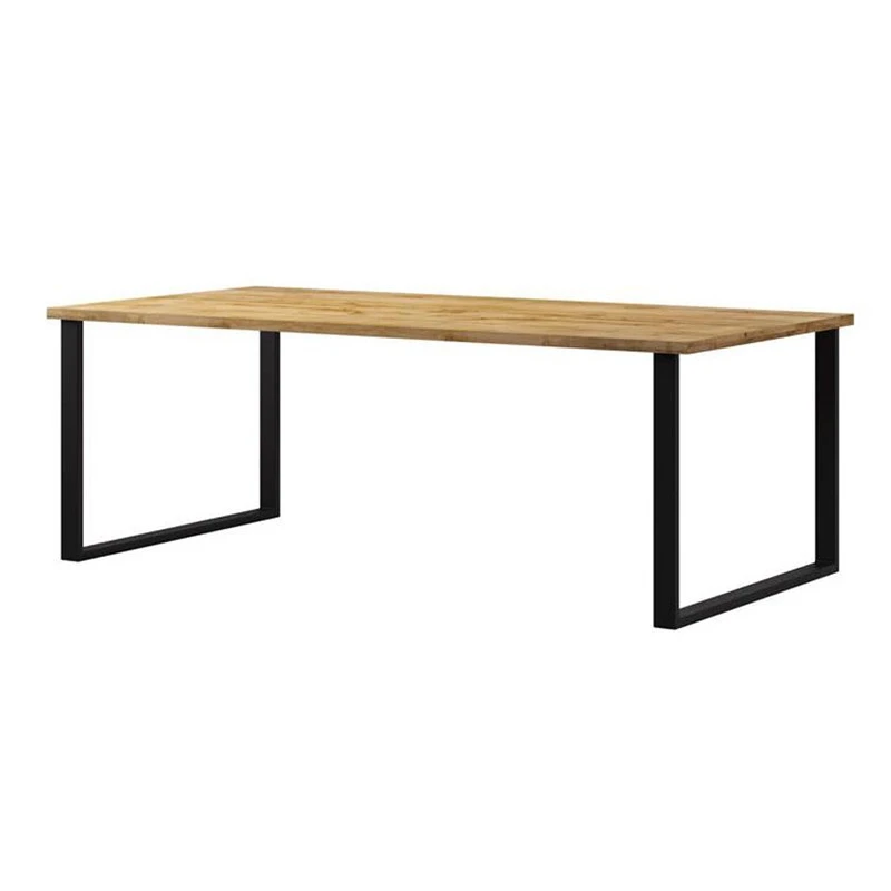 Son plateau bois est monté sur des pieds en métal noir pour un ensemble moderne.